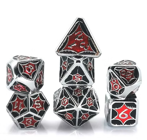 Explore the Spidey Senses dice set at Ogopogo Gaming. This 7-piece set features red and black enamel on silver metal ...