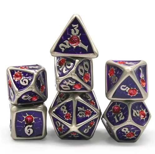 Discover the allure of Third Eye, a 7-piece metal dice set with purple enamel and red accents. Crafted for dedicated ...