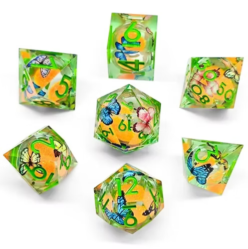 Discover Ogopogo Gaming's handmade 7-piece sharp edge Dark Dreams Dice, designed to show off the hand applied details of flowers and butterflies! E...