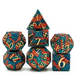 This standard full-sized dice set contains one of each: D4, D6, D8, D10, D12, D20 and Percentile Dice all packaged in a black metal tin.